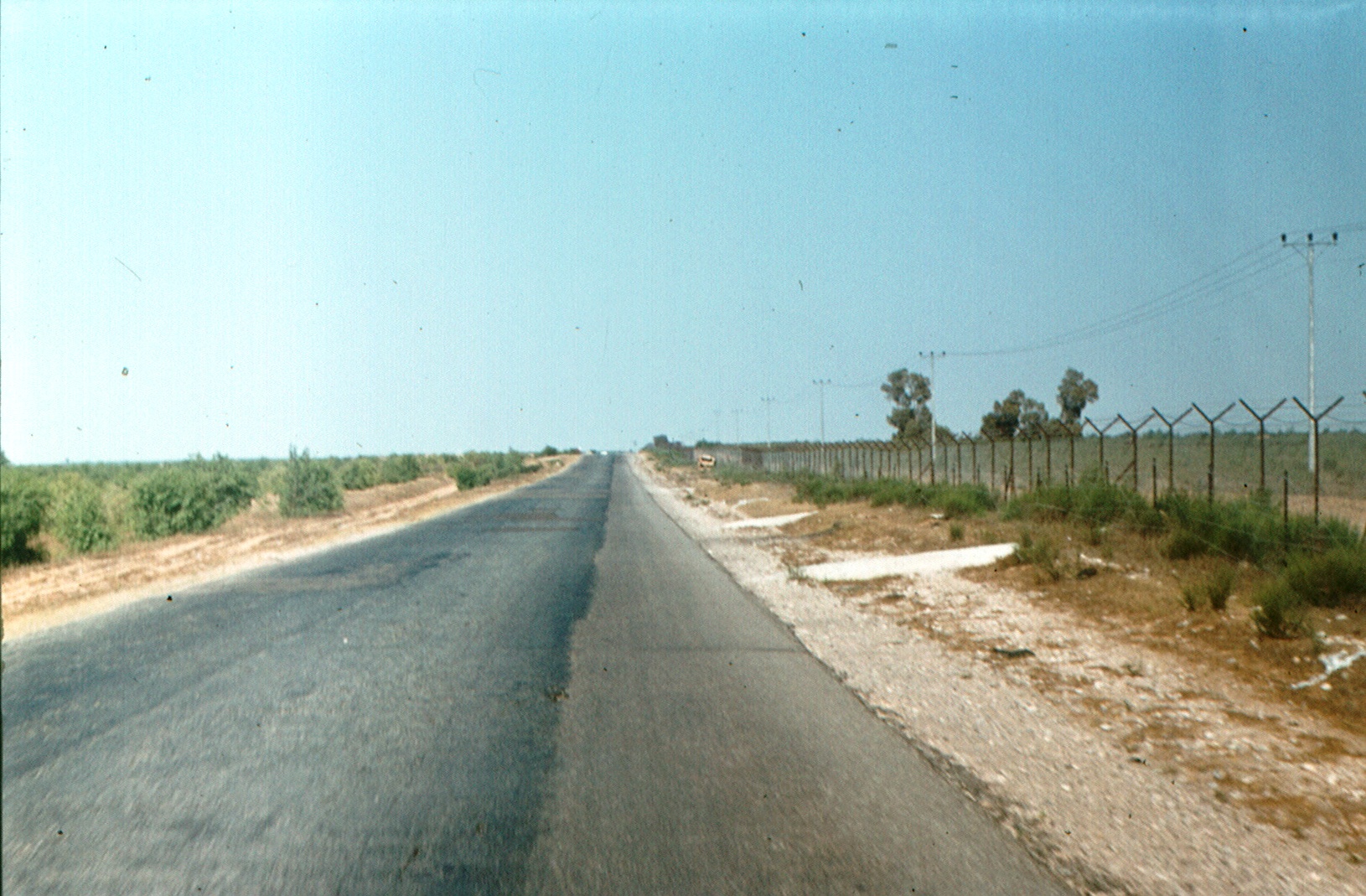![]() Der Gazastreifen 1974 konnte man den knapp 50 km langen Gazazastreifen auf einer gut befahrbaren Straße in einer knappen Stunde ungehinder durchfahren. Der längs der Straße führende 2 1/2 Meter hohe Maschendrahtzaun war eher eine symbolische Abgrenzung des israelischen Kernlandes vom okkupierten Gebiet. |