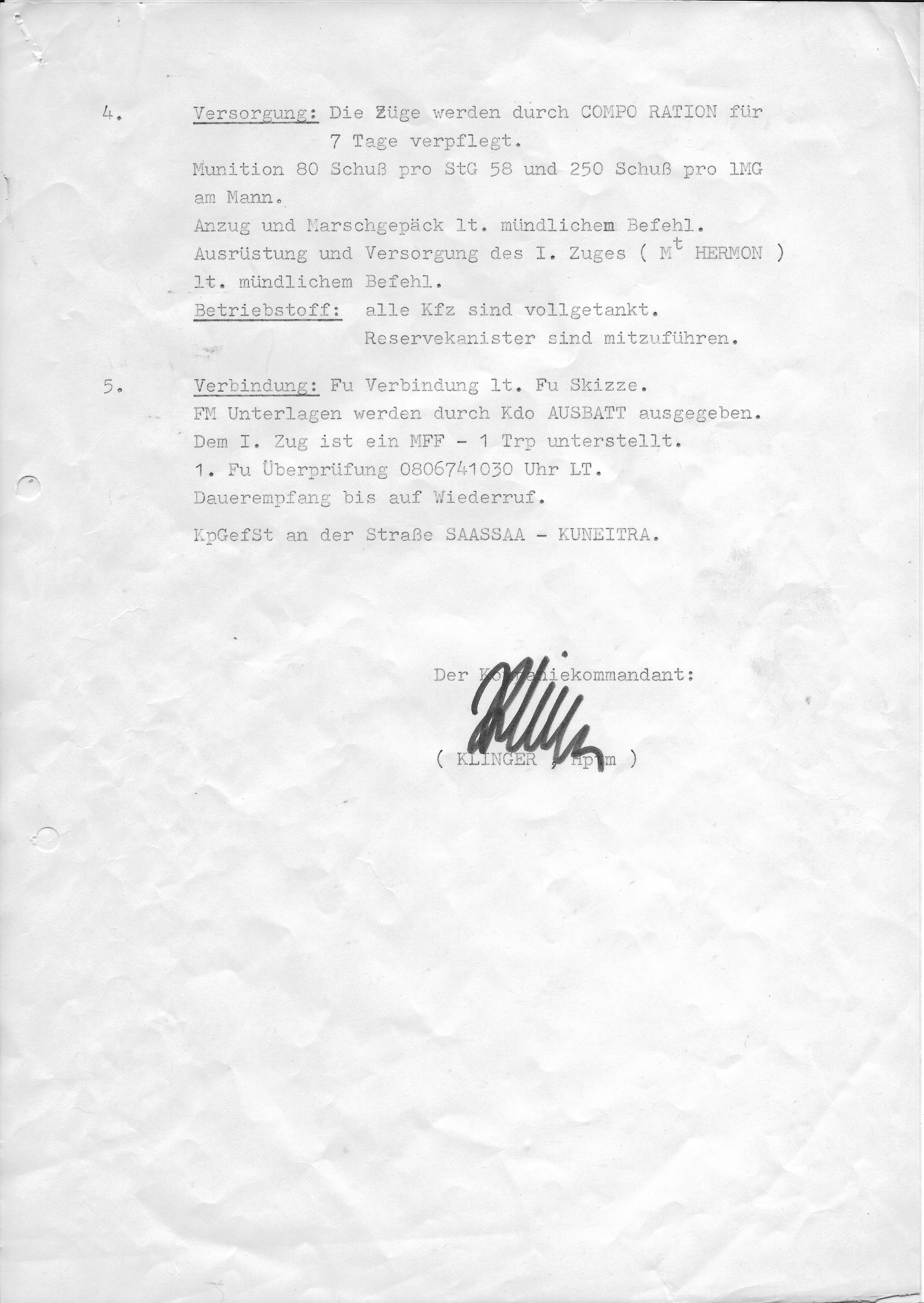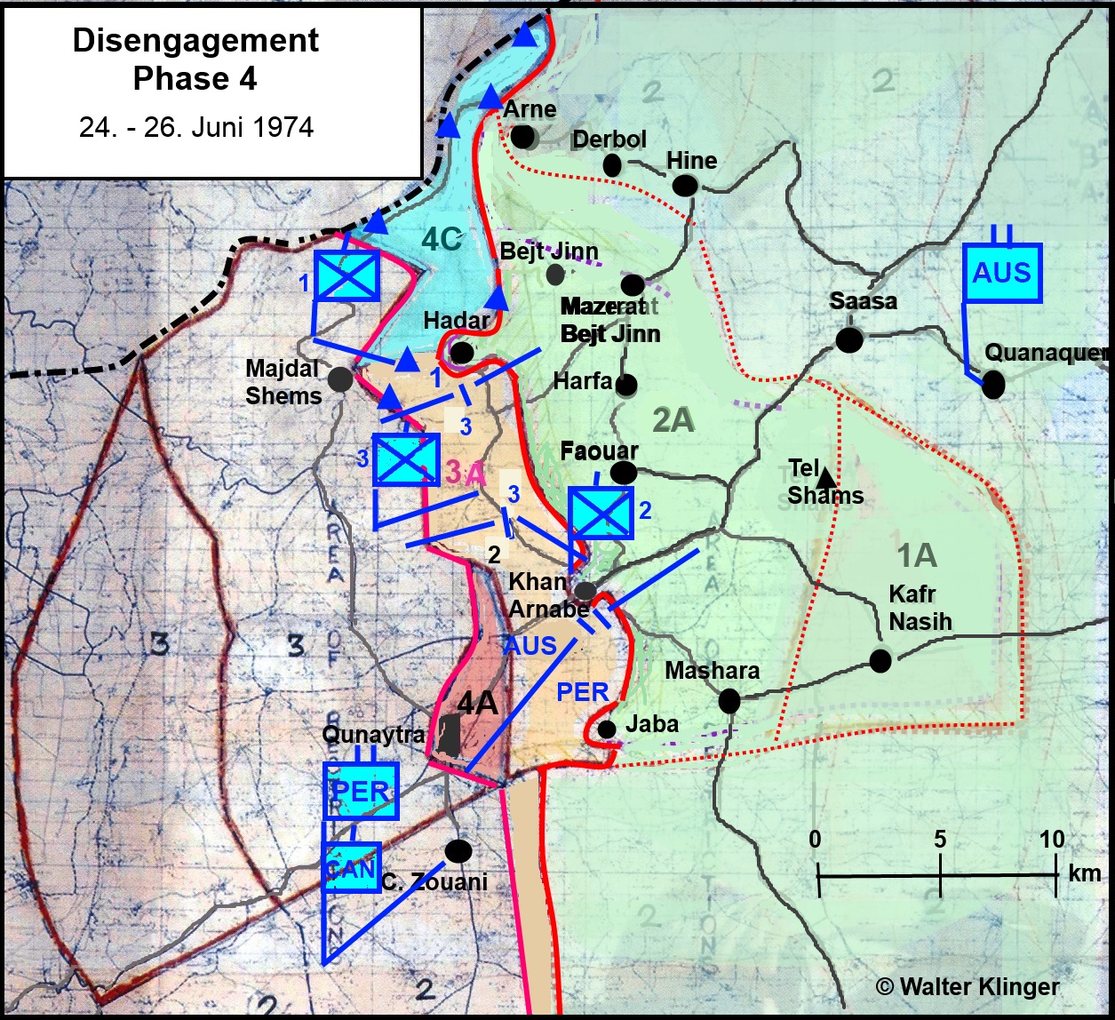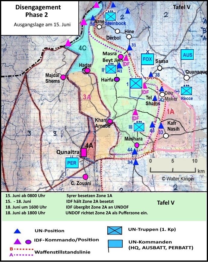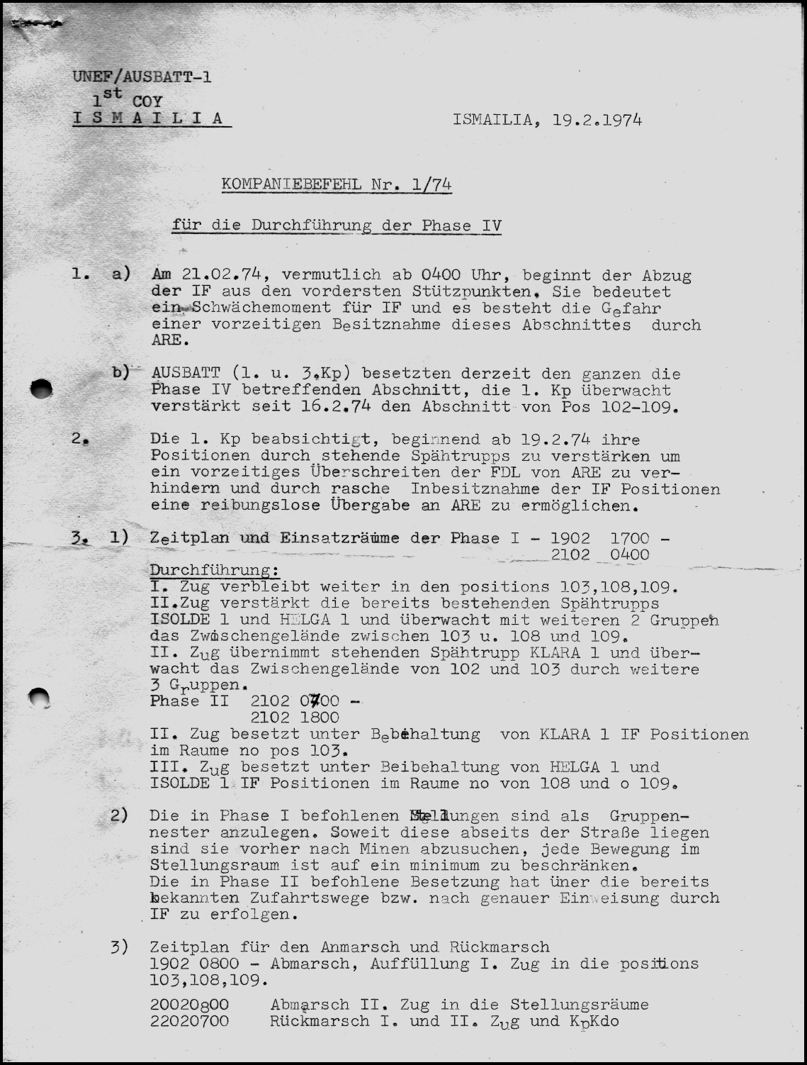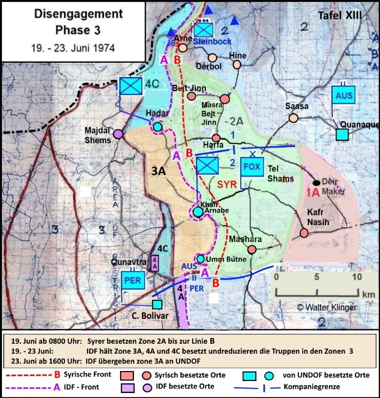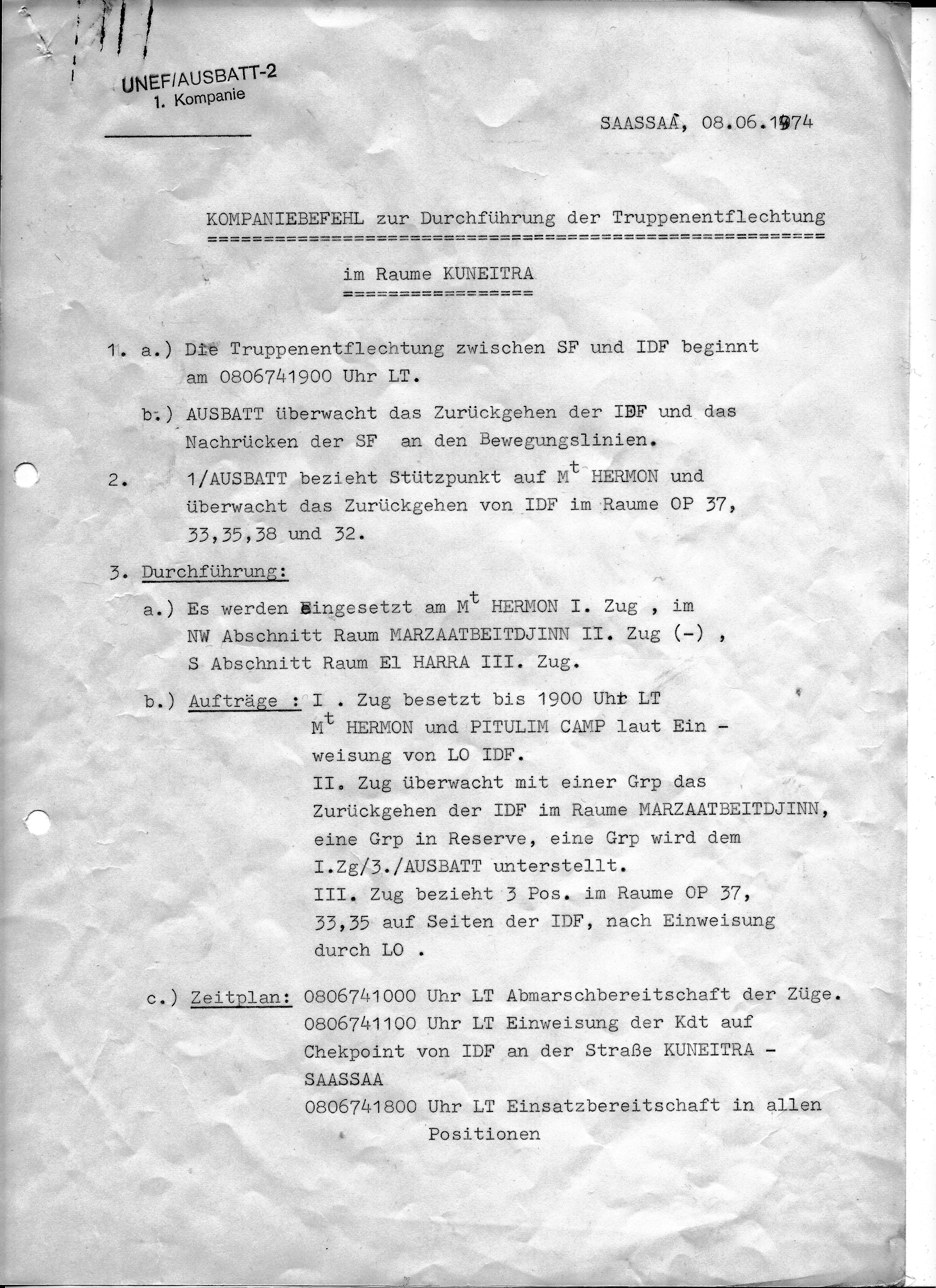 Das bedeutet, dass das Disengagement spätestens am 7. Juni beginnen und innerhalb der folgenden 20 Tage enden musste. Damit war auch klar, dass die ersten 2 Phasen des Disengagements von der 1. Kompanie allein zu bewältigen waren, bis die 2. und 3. Kompanie nachgezogen waren. Montag 3. Juni 1974 |