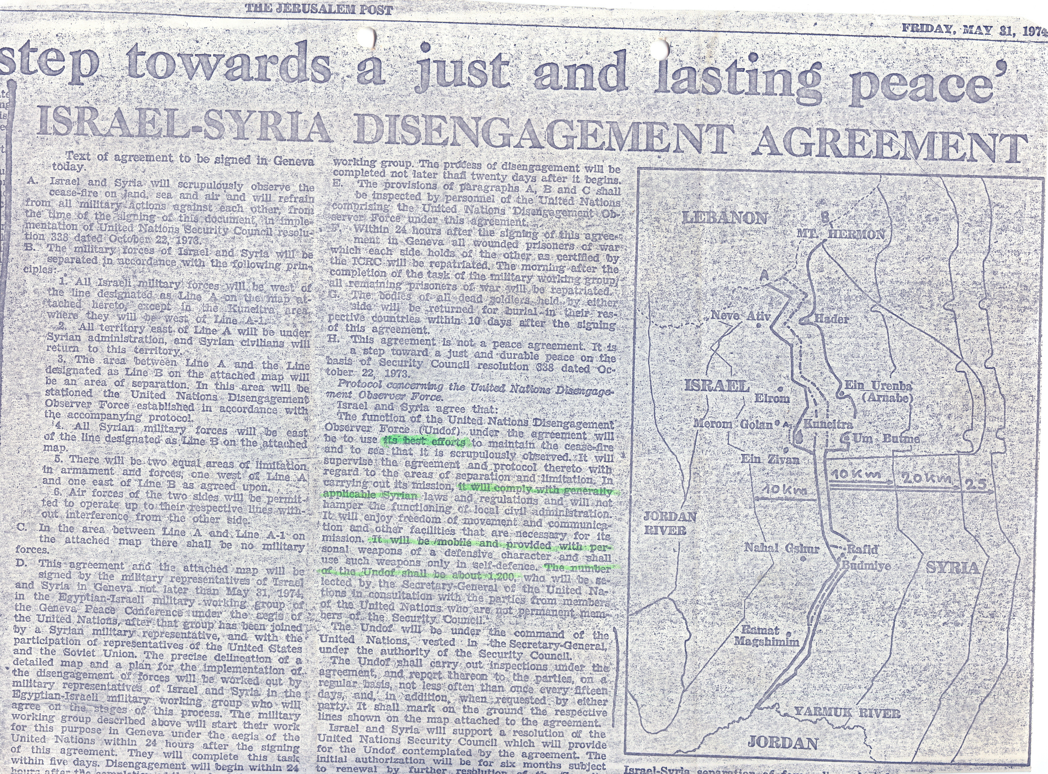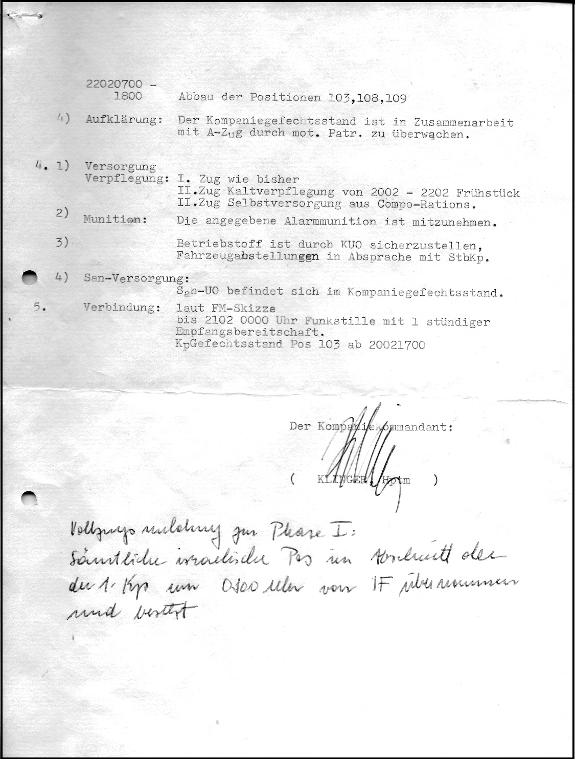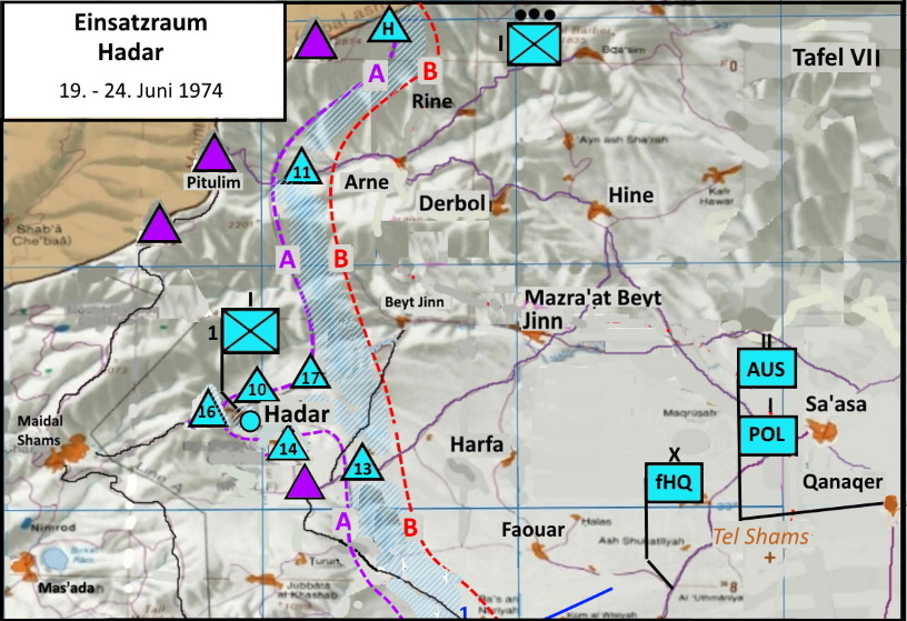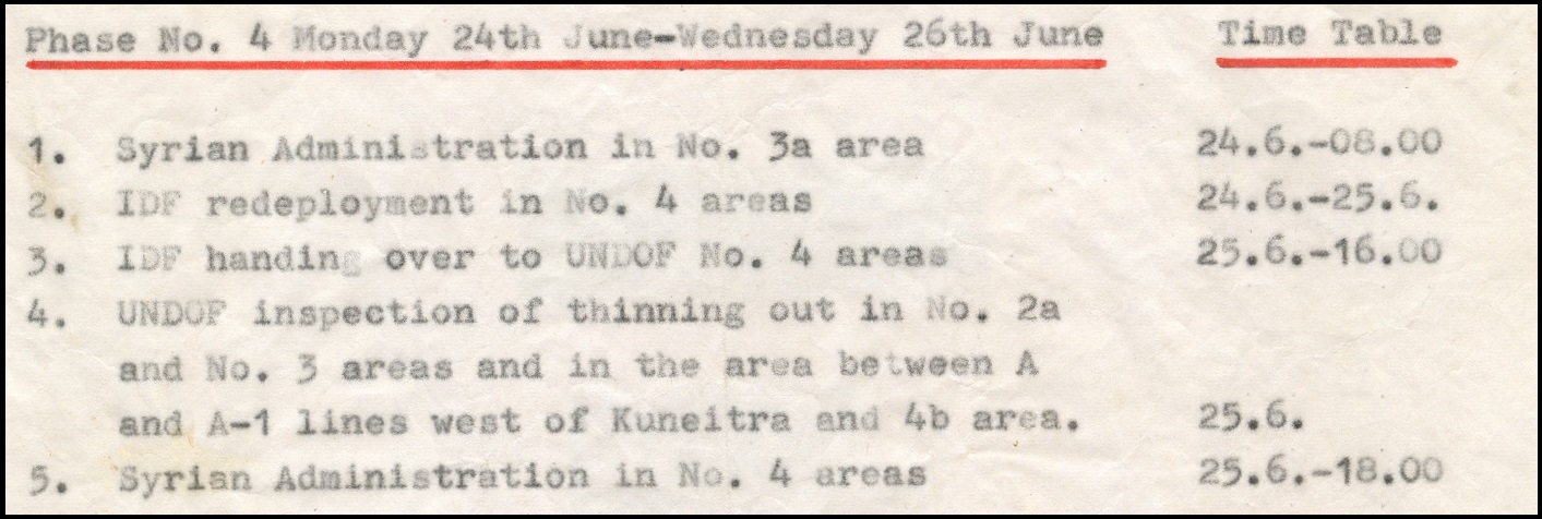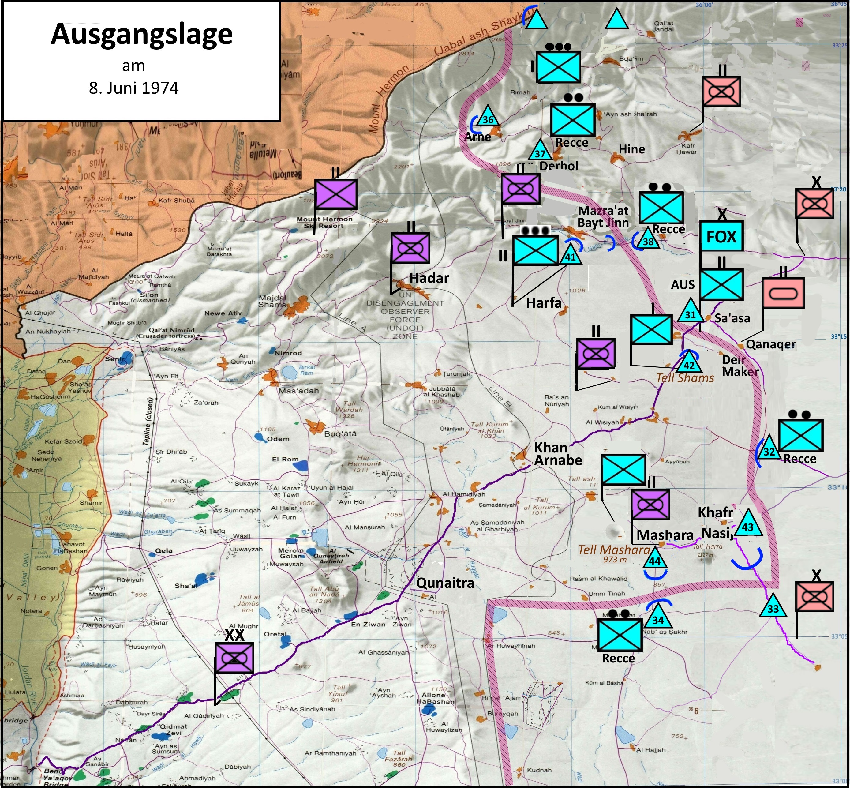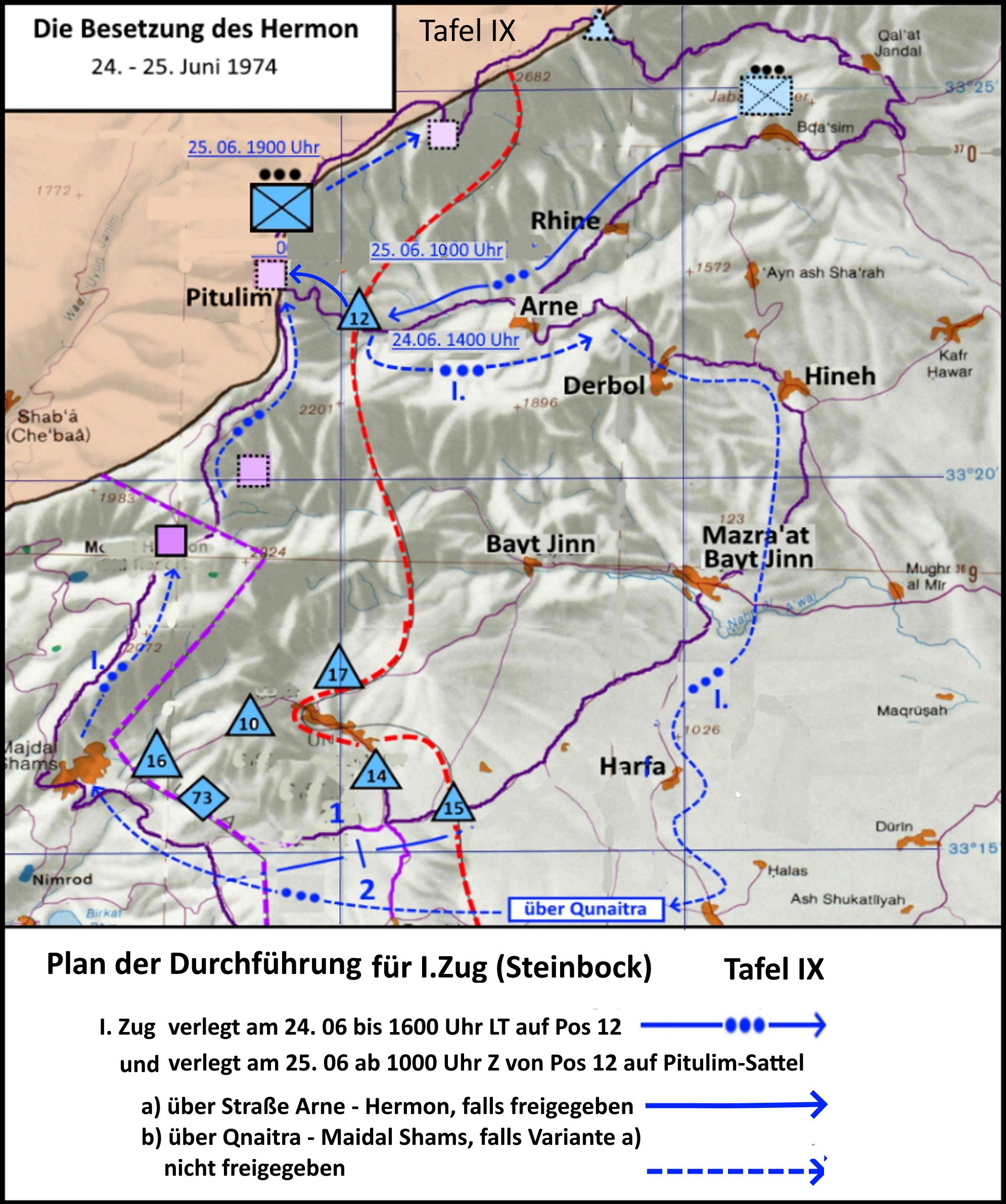 Das bedeutet, dass das Disengagement spätestens am 7. Juni beginnen und innerhalb der folgenden 20 Tage enden musste. Damit war auch klar, dass die ersten 2 Phasen des Disengagements von der 1. Kompanie allein zu bewältigen waren, bis die 2. und 3. Kompanie nachgezogen waren. Montag 3. Juni 1974 |