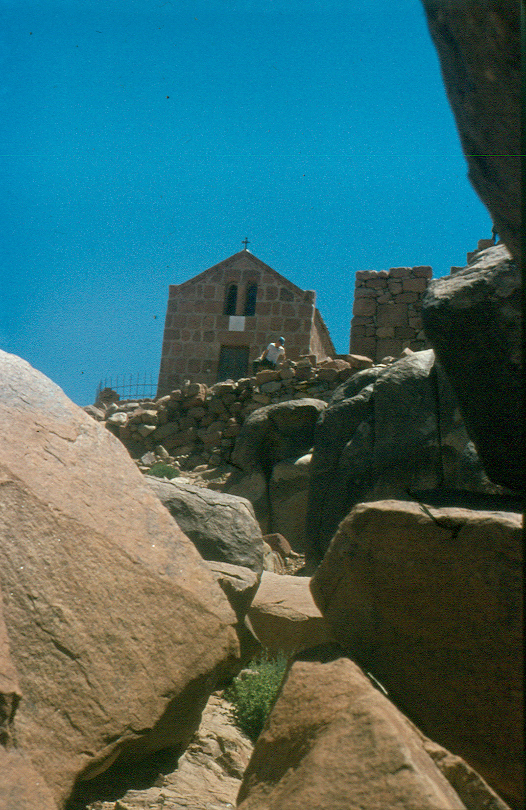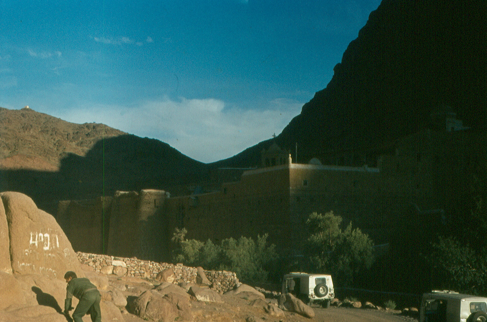Auf Moses Spuren zum KatharinenklosterEiner Initiative unserer Militärgeistlichen und des Wellfareofficers ist es zu verdanken, dass die israelischen Militärbehörden eine Besichtigungsfahrt zum Katharinenkloster und auf den Berg Sinai ermöglicht hatten. Nach relativ ruhiger Fahrt entlang der Küstenstrasse über Abu Rudeis, ging es dann durch das "Wadi Feiran", etwa 90 km über eine Geröllpiste. Trotz der ausgezeichneten Fahreigenschaften, die der Pinzgauer im Gelände zu bieten hatte, waren alle Knochen durchgeschüttelt. Dafür aber entschädigte uns die einmalige Landschaft, durch die uns diese Fahrt führte, bis sie, wie im Finale eines dramatischen Schauspieles mit einem grandiosen Bühnenbild beendet wurde: Vor uns lag das Katharinenkloster, als wären die 1400 Jahre seines Bestehens nicht vergangen. |