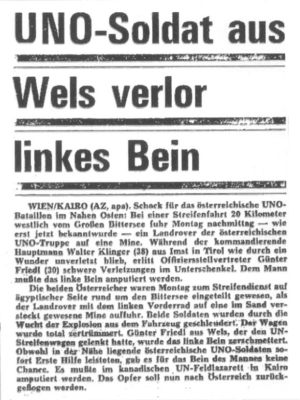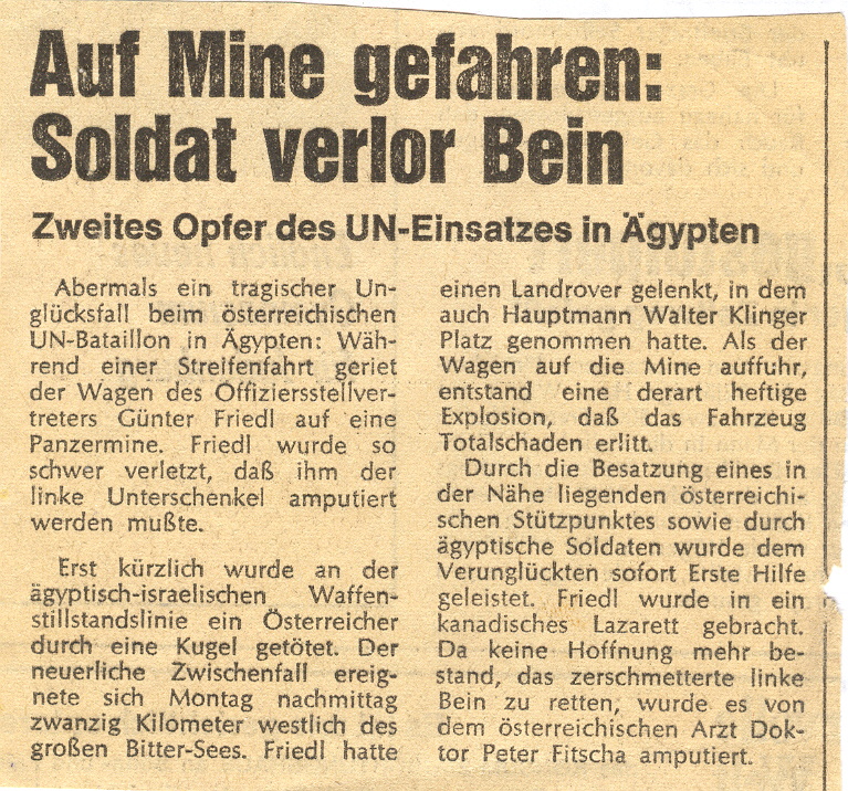 Endlich kommt Hilfe. Man hat die Detonation von 109 aus beobachtet, auch Ägypter tauchen jetzt auf und bald auch ein SanKW. Die Bergung aus dem Minenfeld ist äußerst gefährlich, weil die Minen nicht regelmäßig ausgelegt sind. Friedl ist entlich versorgt und wird mit dem SanKW weggebracht. Nun fange ich erst klar zu denken an, wieso das passieren konnte. Bin ich von der Spur abgewichen oder hat man die Minen erst seit Kurzem verlegt und warum. Eigentlich hätte es bei unserer Fahrt vom 27.12. krachen müssen, wenn das Minenfeld schon vorhanden gewesen wäre. Eine nachträgliche Verlegung der Minen passt einfach nicht in unser Erfahrungsschema. Ich gehe zur nächsten Stellung; es ist die selbe, wo wir schon einmal waren. Dort treffe ich einen Oberst, der mir auch keine Erklärung geben kann - oder nicht will? Er fährt mich jedenfalls bis zu dem Verbandsplatz, wo ich Friedl wieder sehe, Er wird gerade von unserem Arzt Htm Dr. Fitscha betreut und auf den Transport nach Kairo vorbereitet. Hubschrauber gibt es keinen. Irgendwie komme ich dann wieder in meine Pos 108 wo bereits Hptm Riedl von der UN-Militärpolizei auf mich wartet. Dem gebe ich alles zu Protokoll. Eine Rückkehr nach Ismailia lehne ich ab da ich jetzt von meinen Leuten gebraucht werde. Irgendjemand schickt mir eine Flasche Kognak heraus. Bei der sitzen wir alle noch bis spät in die Nacht. |
