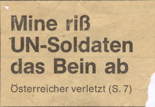 Samstag 6. JuliStehe früh auf um am Vormittag noch den besagten Koffer und einige Andenken zu kaufen. Bis zum Abflug um 1500 Uhr bleibt noch einige Zeit, sich in Damaskus umzusehen. Als ich dann endlich meinen Lederkoffer bezahlen will, merke ich, dass meine Brieftasche fehlt. Ob-wohl derartiges in Damaskus nur selten vorkommen soll, muss ich mich damit abfinden, dass die 5 Pfund, die ich im Hosensack fand, gerade noch ausreichten, um mit dem Taxi ins HQ zu fahren und dort um Hilfe zu ersuchen. Man borgt mit großzügig das für den Heimflug nötige Geld. Das reicht, um am Flughafen noch einige hübsche Andenken zu kaufen, um nicht ganz mit leeren Händen heimzukehren. NachschlagEinige Monate später, im Zuge einer Rotation entsann sich die heimische Presse - allen voran der kleinformatige Boulevard - des tragischen Minenunfalls vom Juni 1974. Anlass waren offenbar falsch interpretierte Aussagen von Heimkehrern, die zu den ohnehin spärlichen Informationen seitens der UNDOF und des BMLV neuerlichen Skandalstoff zu liefern schienen. So wurden auch die ersten, vorwiegend konfusen und widersprüchlichen Presseberichte wieder aufgewärmt, wie etwa die Behauptung der Isreaelis, die Österreicher hätten in dem von den Isrealis besetzten Teil des Hermon eine für jeglichen Verkehr noch gesperrten Weg benützt