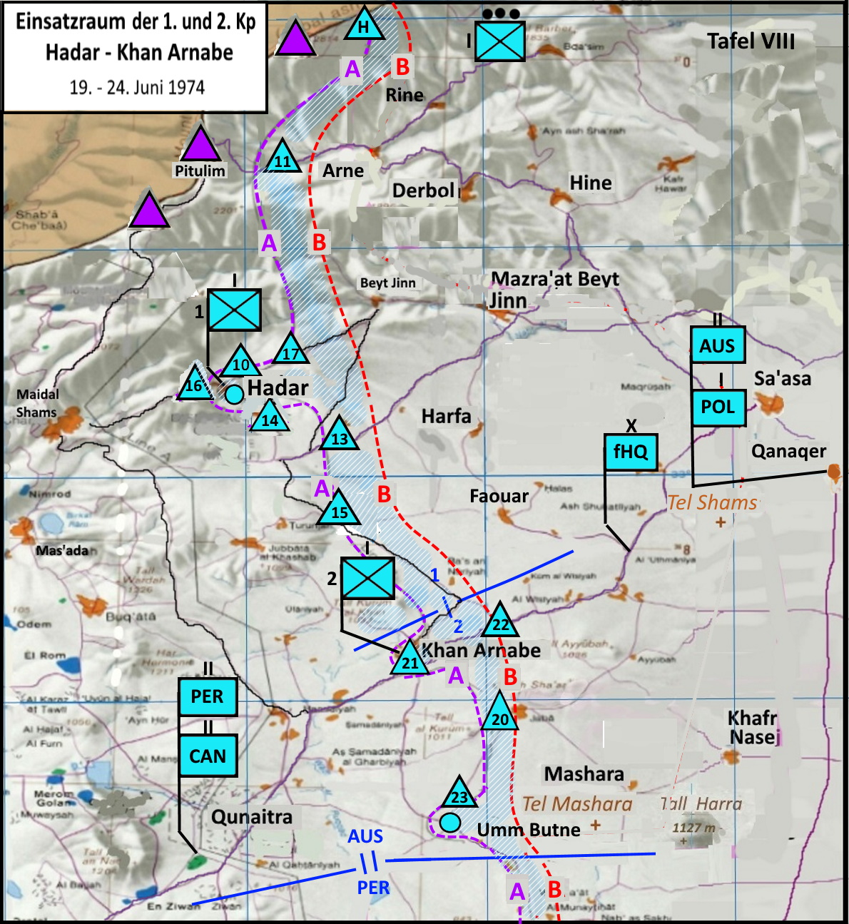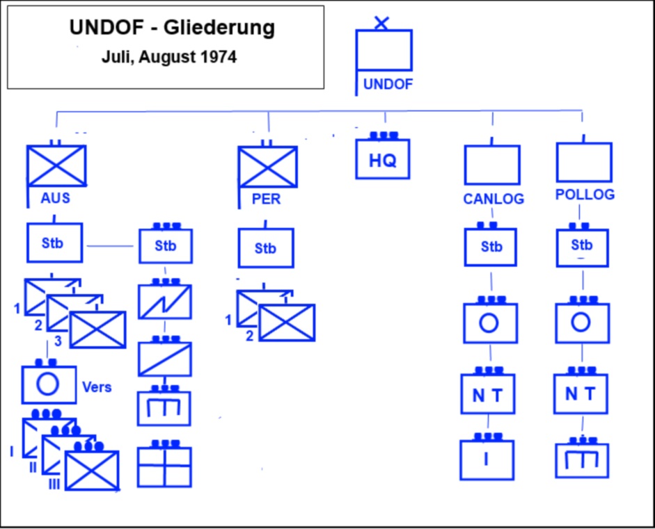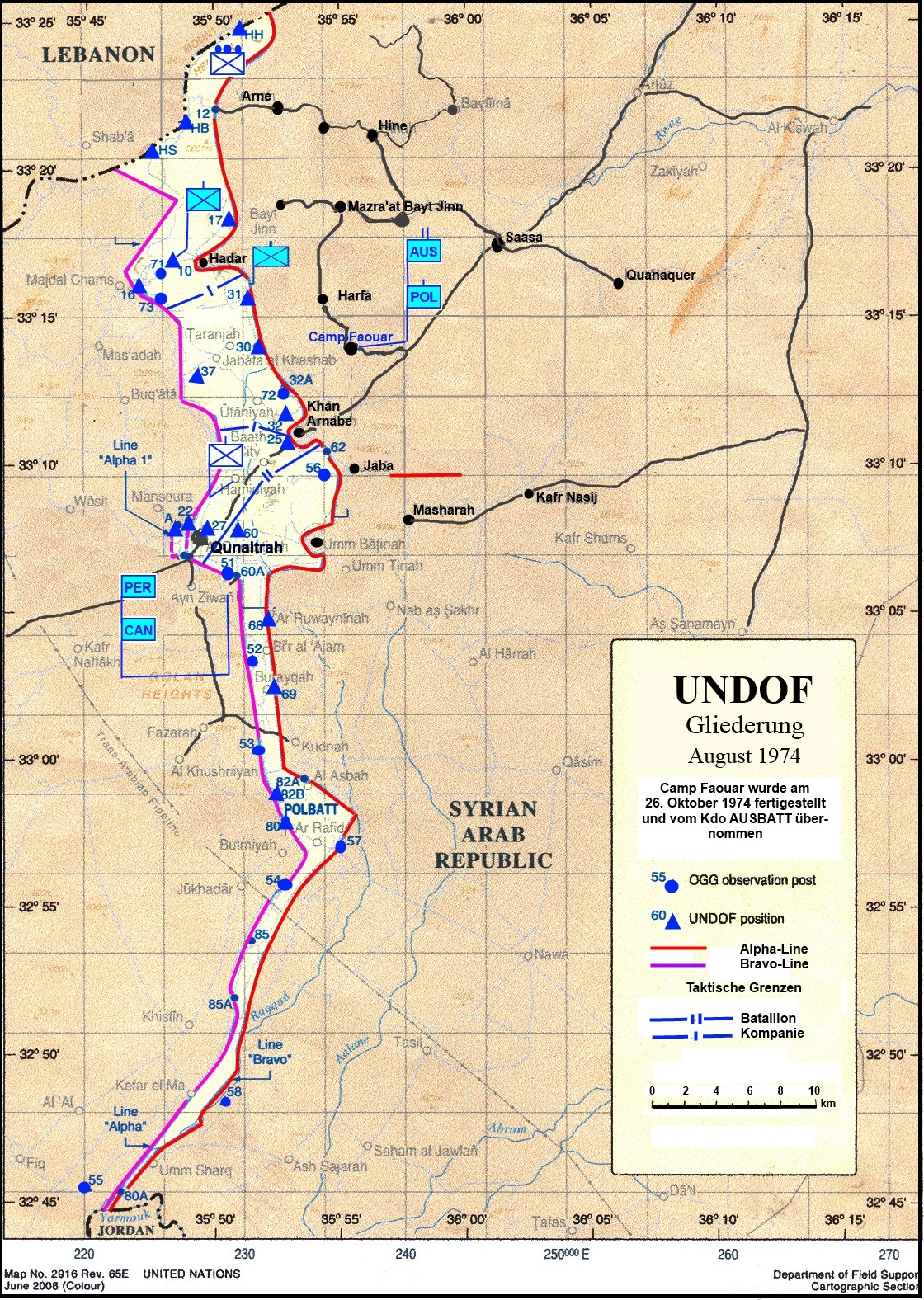 Das Disengagement - AblaufplanAn mobilen Einsatzkräften verfügte UNDOF vorerst über 570 Mann - 200 Peruaner, 200 Österreicher, sowie 60 Polen und 110 Kanadier als Versorgungs- und Unterstützungskräfte.Wir waren daher angesichts der Tatsache, dass zwei bis an die Zähne bewaffneten Kriegsparteien von einender zu trennen waren,fest überzeugt, dass UNDOF alle seine Kräfte aufbieten müsse und Österreicher wie Peruaner gemeinsam zum Einsatz bringen müsse. Von den Peruanern, die mit uns am 4. Mai ebenso nach Syrien verleget wurden, war aber keine Spur zu sehen. Das war zwar verständlich, da sie ihr Basislager auf israelischer Seite nahe Qnaitra bezogen hatten, ihre Offiziere waren aber auch bei keine der Vorbereitenden Maßnahmen zu sehen. Bald war klar, dass ihr Einsatz im Gegensatz zu dem was uns bevorstand, lediglich auf den Südabschnitt beschränkt war und keine Truppentrennung erforderlich war. Für die uns gestellte Aufgabe hätte es eigentlich des gesamten Bataillons bedurft. Aber wie schon in Ägypten, war auch die UNDOF nicht frei von Führungsschwächen, wie die nächsten Wochen noch zeigen werden. Außer einer bescheidenen Fahrzeugspende - 3 Jeeps - fand das AUSBATT keinerlei personelle Unterstützung. So musste auch das vorgeschobene Hauptquartier (fHQ) vom Stabspersonal des Bataillons errichtet und betrieben werden. Lediglich der Rückwärts-Funkverkehr wurde von einer kanadischen Crew geführt. Da der Gefechtsstand den Truppenbewegungen folgen musste, musste Fox dreimal verlegt werden - und das ausschließlich mit dem österreichischen Stabspersonal.