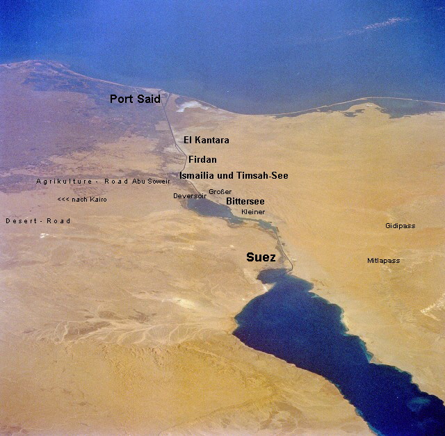 Das Satellitenbild zeigt uns den Suezkanal in seiner ganzen Länge. Bei Vergrößern des Bildes durch anklicken auf volle, sind auch die Landschaftsformen Straßen und Ansiedlungen wie deren Beschreibung genau zu erkennen. Schon seit dem 14. Jahrhundert vor Chr. hatten die alten Ägypter eine Kanalverbindung zwischen dem Mittelmeer bzw. dem Nil und dem Roten Meer geschaffen. Ein Teilstück davon ist bis heute mit dem Ismailia-Kanal erhalten geblieben und verbindet Ismailia durch einen für kleine Kähne schiffbaren Wasserweg mit dem Niltal. Es ist überliefert, dass der Altägyptische Kanal unter einem schlechten Stern gestanden habe, denn ein Orakelspruch aus der Zeit des Pharao Necho (616-600), besagt, dass der Kanal nur den Fremden nützen würde. Dieses Orakel scheint sich voll bewahrheitet zu haben, als nach Fertigstellung des modernen Kanals die damaligen Kolonialmächte England und Frankreich die Kontrolle über das Gebiet übernahmen Erst 1956 wagte es der damalige Staatschef Ägyptens, Gamal Abdel Nasser, die nationalen Eigentumsrechte einzufordern und den Kanal samt seiner Betriebseinrichtungen zu verstaatlichen. Aus den beträchtlichen Einnahmen der Schiffspassagen sollte der Assuanstaudamm finanziert werden. zurück zum Inhaltsverzeichnis |