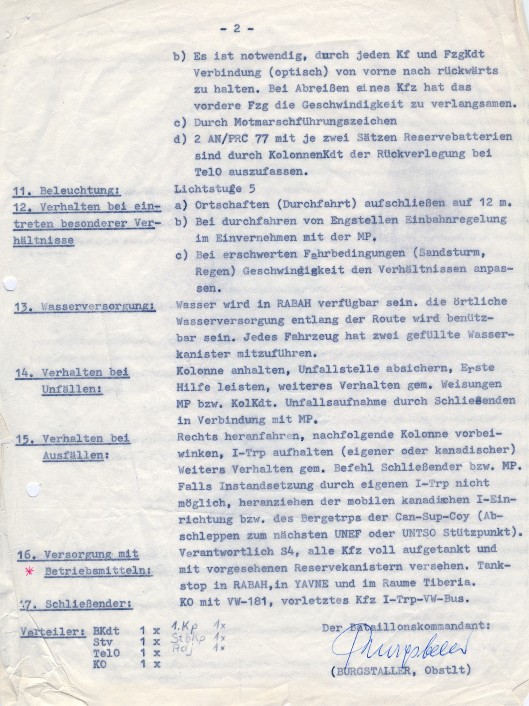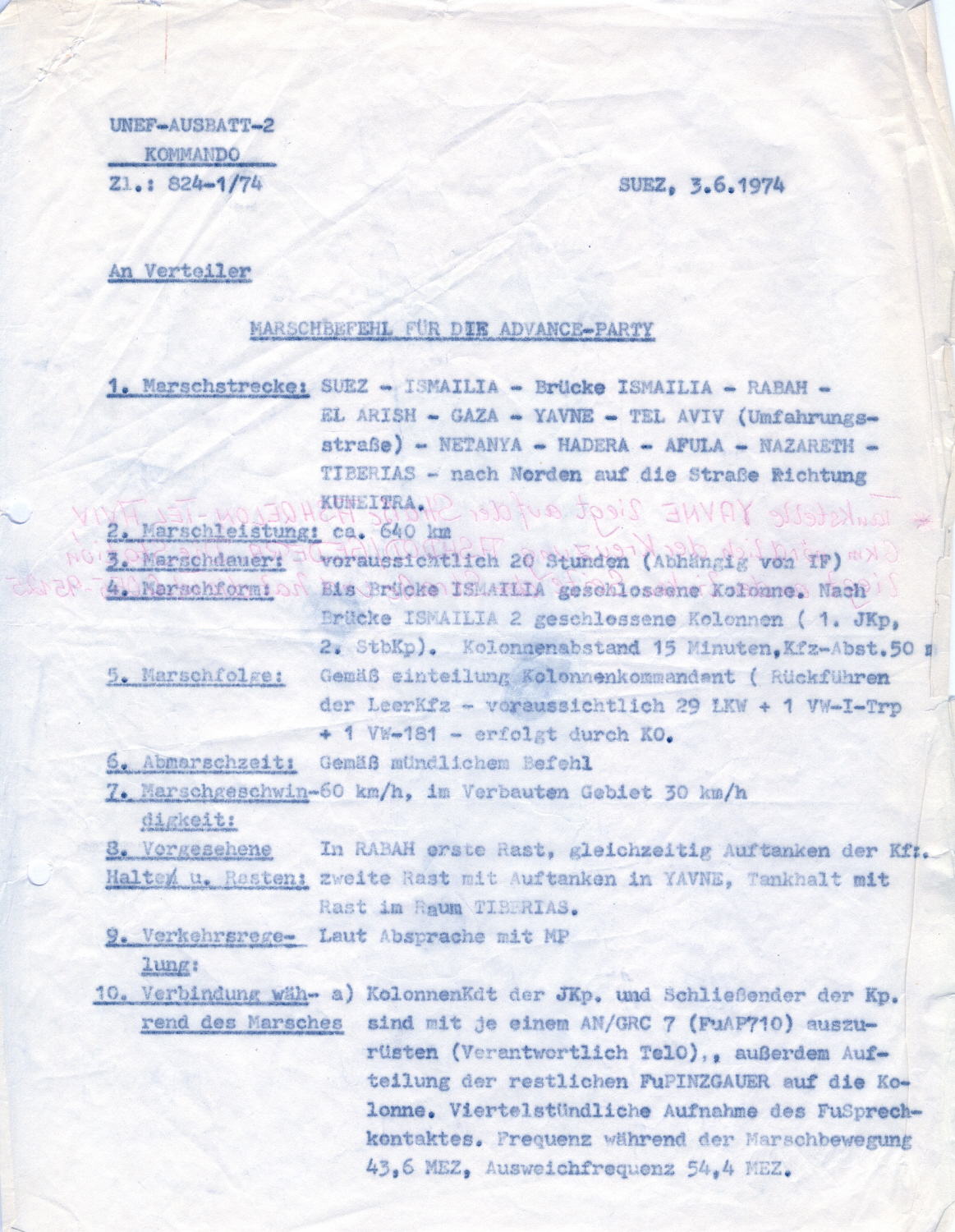 Der schon am Vortag vom BKdo erstellte Marschbefehl war in den wesentlichen Punkten an die Fahrzeugkommandanten ausgegeben: Geschlossene Kolonne in 2 Marschpaketen bis Ismailia. |