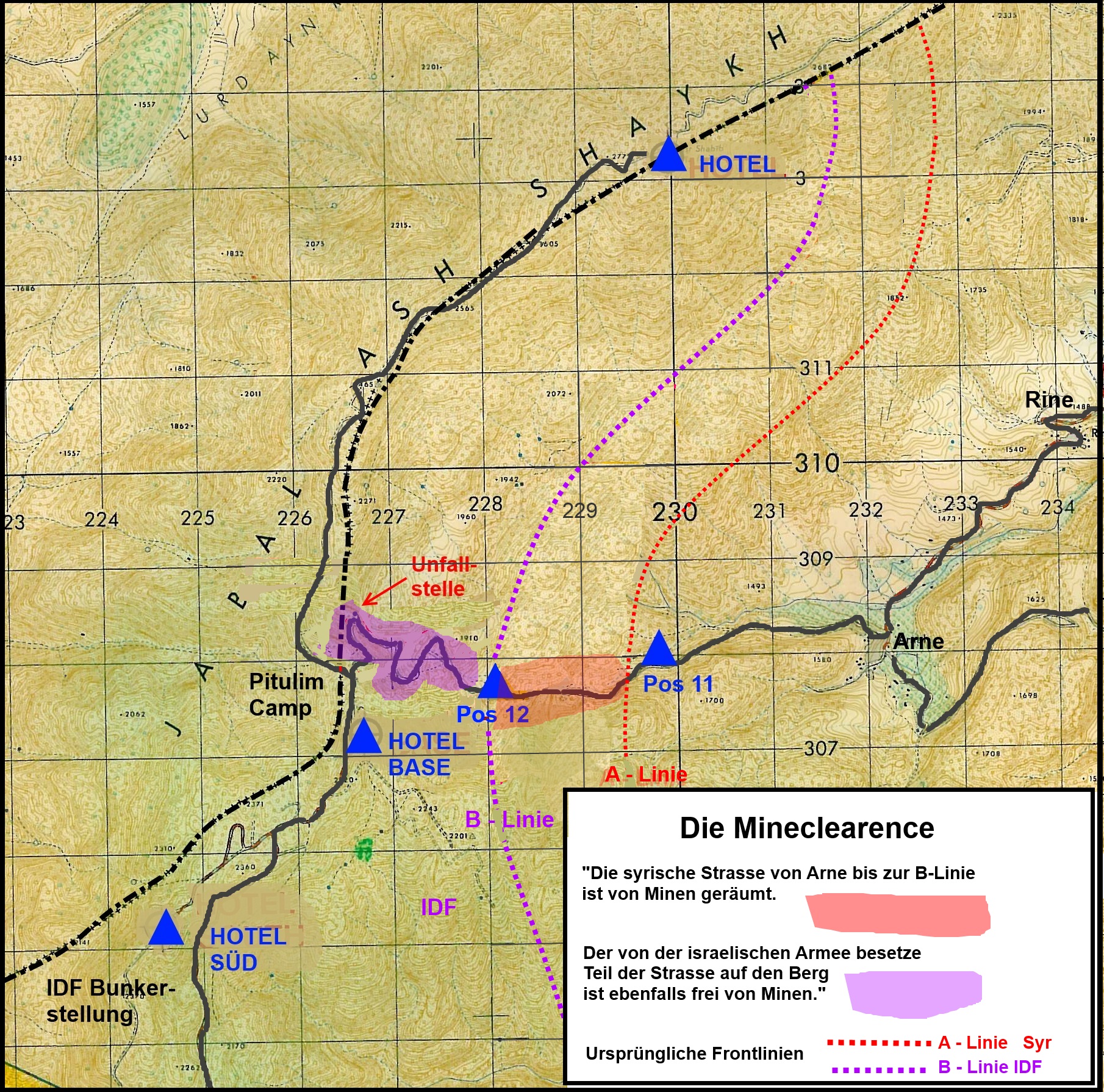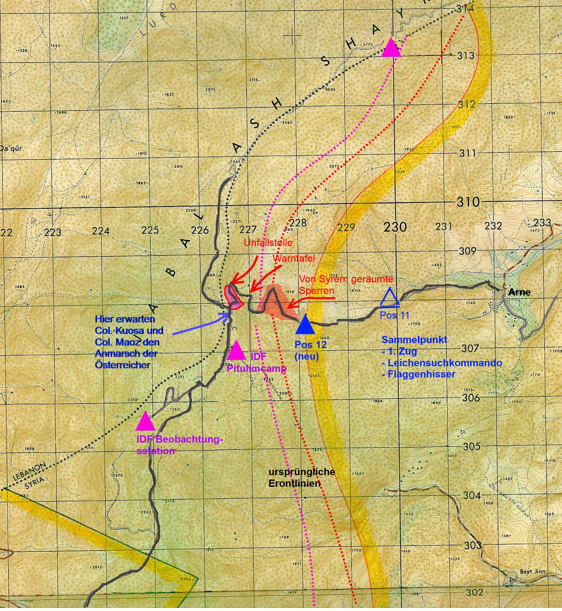 Vorerst war es allen Anwesenden ein Rätsel, wie es zu diesem Unfall kommen konnte. Ich ließ es dabei bewenden und begab mich wieder auf den Rückweg an die Unfallstelle. Die Pioniere waren bereits dabei, die Straßensperren mit einem Bulldozer zu beseitigen die Sanitäter machten sich wieder auf den Rückweg, denn Zgf Hofer war inzwischen seinen Verletzungen erlegen. Ich kam gerade noch dazu, als er mit den anderen Toten abtransportiert wurde. Hier wurde mir erst bewusst, dass von der Explosion der Mine bis zu meiner Rückkehr, höchstens 2 Stunden vergangen waren, dass die Rettungstrupps der Israelis innerhalb von 30 Minuten vor Ort waren, dass die eigenen San-Trupps aus Quanaquer ebenfalls in Rekordzeit an der Unfallstelle eintrafen, und dass das Menschenmögliche getan wurde, auch wenn es vergeblich war. Am Nachmittag kommt dann der Befehl, die Besetzung des Hermon über die israelische Seite zu vollziehen. Um 2100 Uhr L erstatte Lagemeldung an Bkdo: