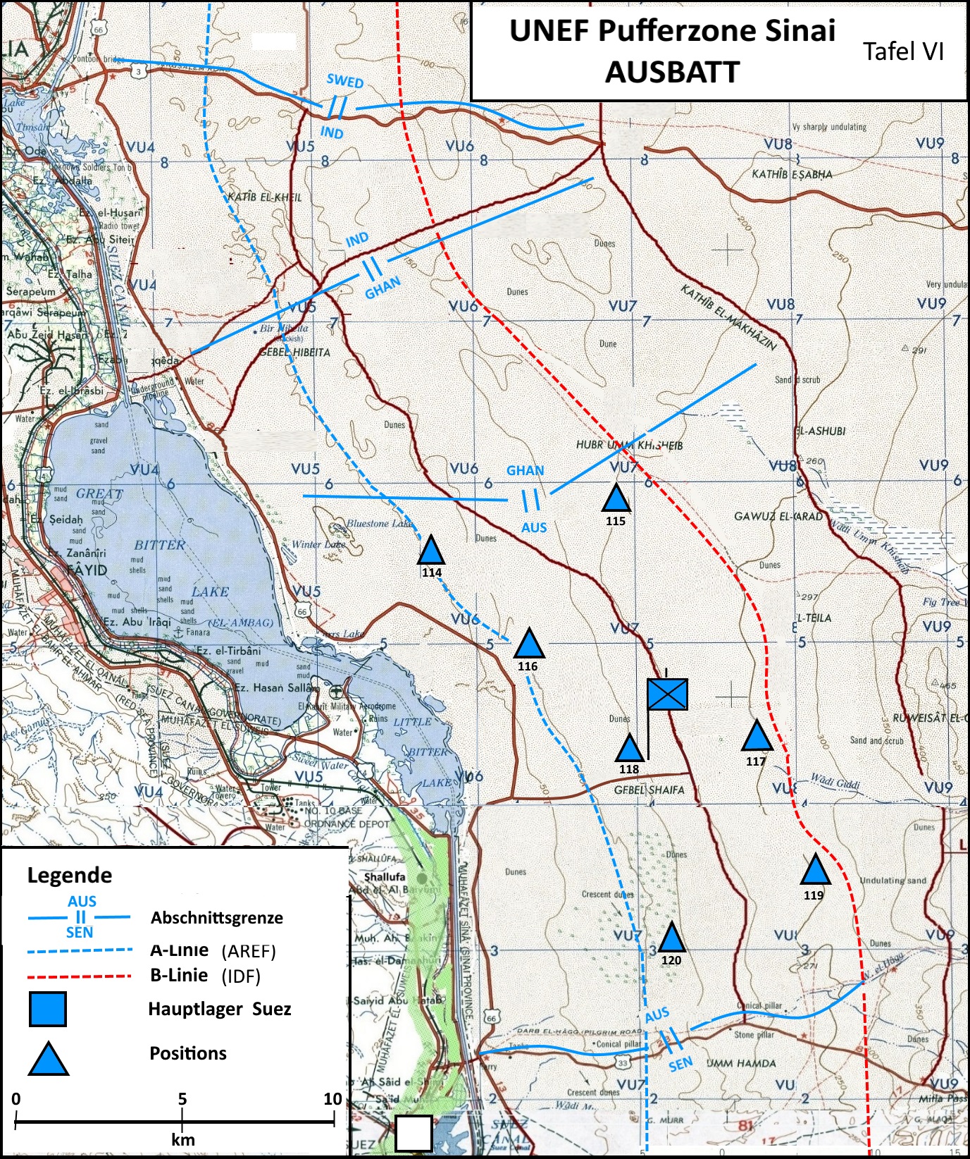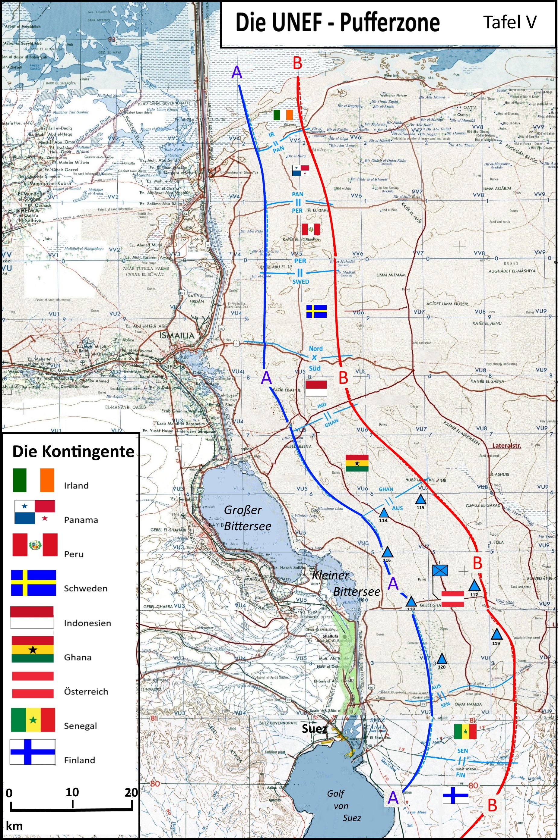 Diese Zone verlief parallel zum Kanal als 10 km breiter Streifen, vom Mittelmeer bis zum Golf von Suez. Westlich dieser Zone hatten die Ägypter das von ihnen in den ersten Tagen des Jom-Kippur-Krieges eroberte Gebiet wieder besetzt, während die Israelis sich nach Osten, in das Landesinnere der Sinai zurückgezogen hatten. Die Grenzlinien, zu den Ägyptern "Alphaline", zu den Israelis "Bravoline" genannt, wurden mit leeren Benzinfässern markiert. Die Aufstellung dieser Grenzmarkierungen wurde unmittelbar nach der Unterzeichnung des Truppenentflechtungsabkommens begonnen und von einer gemischten Kommission überwacht. Obwohl der Grenzverlauf von den Parteien offiziell abgesegnet war, wurde vor allem von ägyptischen Truppenführern immer wieder der Versuch unternommen, durch Versetzen der Fässer, ihre Eroberungen um einige hundert Meter weiter in die Sinai auszudehnen. Geplant ist die nahtlose Übergabe der 7 senegalesischen Positions 112, 113, 114 an der Bravoline zu IDF und 115, 116 und 117 an der Alphaline zu AREF. Lage der Positions einschließlich der Zeltausrüstung sollen von SENBATT unverändert übernommen werden. |