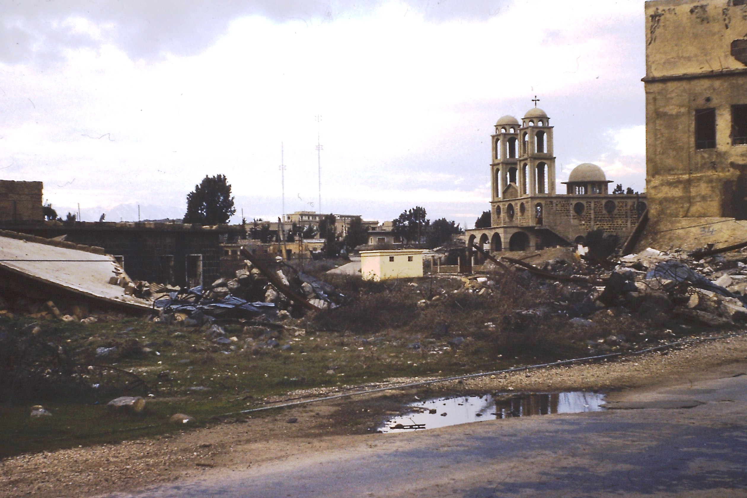 Nun nähern wir uns wieder dem Krieg: stellenweise syrische Panzerwracks und Ruinen. Dann kommt Qunaitra: Wir passieren ein Trümmerfeld, das einmal Lebensraum für 30 000 Seelen, - Muslime und Christen, - gewesen sein soll. |