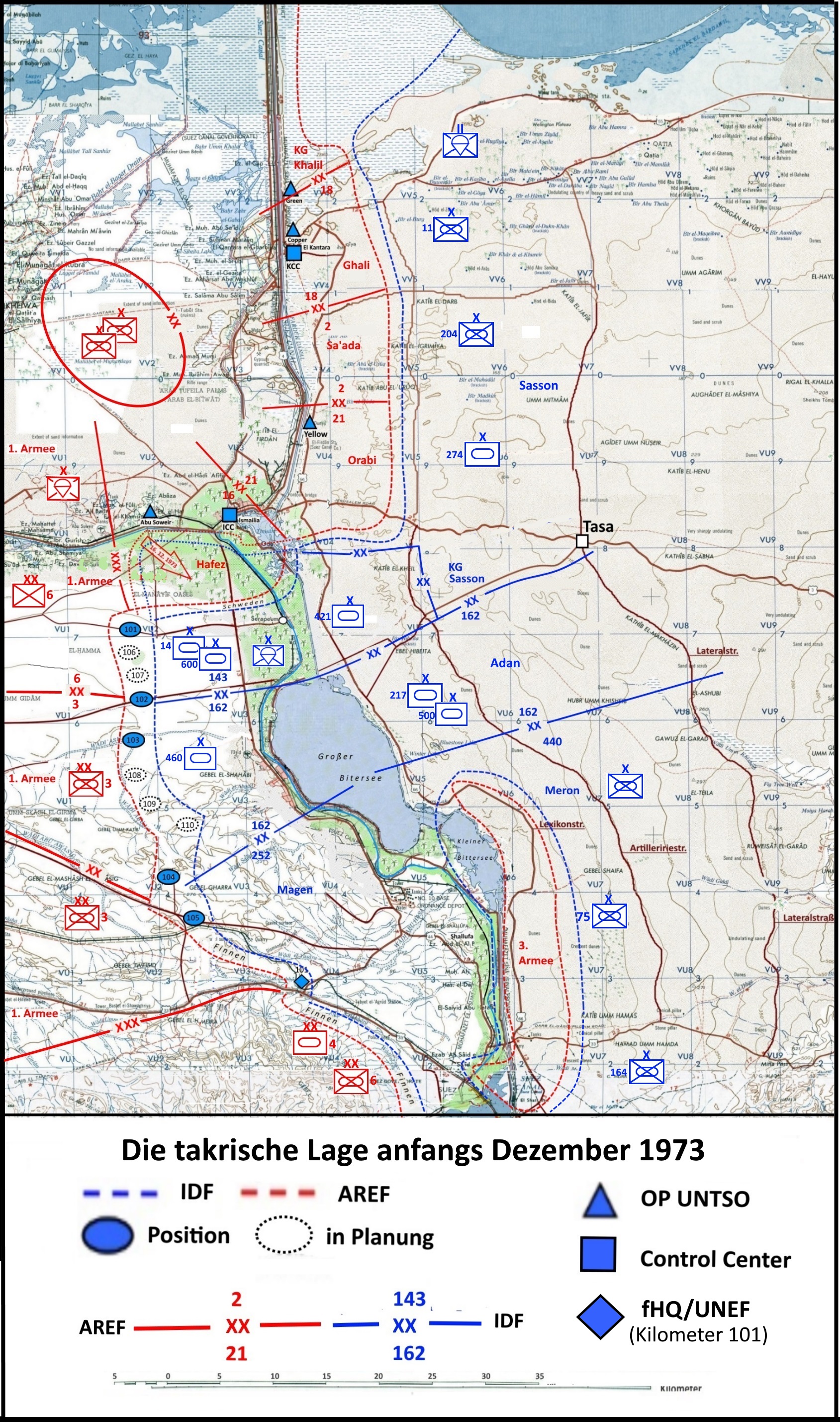 Die allgemeine LageDer Jom Kipur-Krieg war zwar seit Ende Oktober durch einen äußerst labilen Waffenstillstand beendet. Die Kampfhandlungen konnten jederzeit wieder zum Ausbruch kommen, was durch die täglichen, von beiden Seiten geführten Feuerüberfälle mit Artillerie und schweren Waffen zum Ausdruck kam. Die 3. Ägyptische Armee war zwar auf der Sinai Halbinsel so Suez von allen Versorgungsmöglichkeiten abgeschnitten, das gleiche Schicksal drohte aber auch den israelischen Truppen, die unter der Führung des General Sharon am Westufer des Suezkanals einen Brückenkopf bildeten, falls es zu einer Fortsetzung des Krieges kommt.Dank der materiellen Unterstützung der Sowjets, konnten die Ägypter ihrerseits einen Belagerungsring um diesen Brückenkopf aufbauen, der Tag für Tag massiver wurde. |