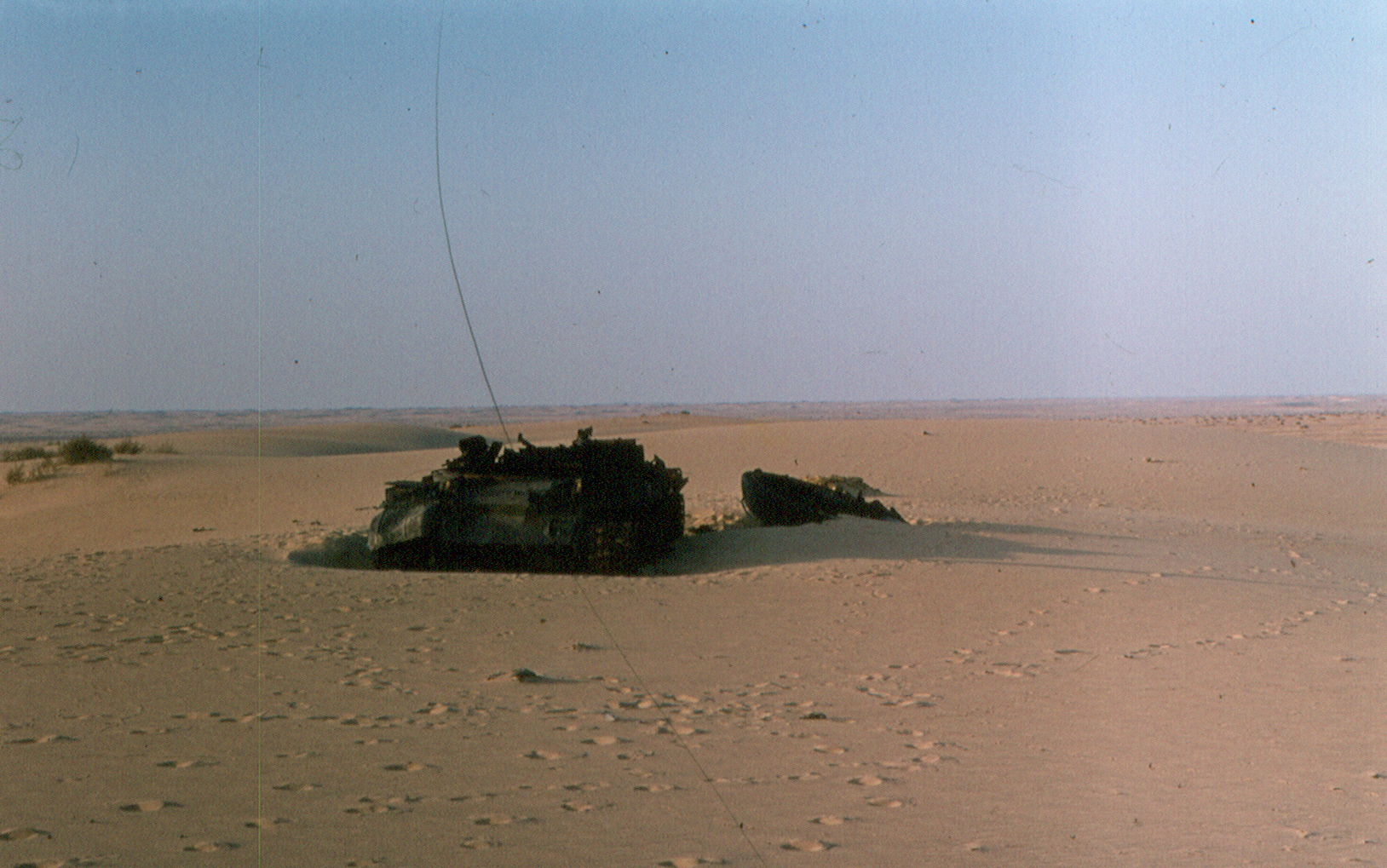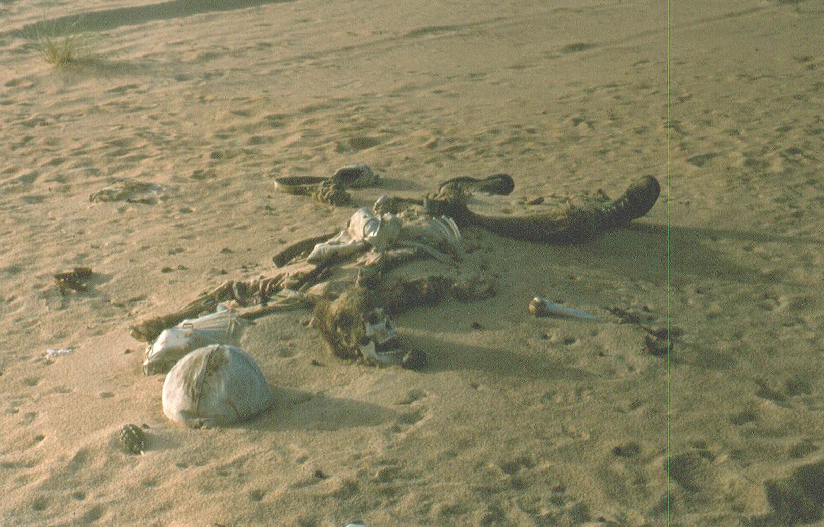 Unmittelbar im Nahbereich der Position 114 befand sich eine Stelle, an der eine ägyptische Panzereinheit, vermutlich aus der Luft, vernichtet wurde. Über diese Stelle führte der einzige Zugang zur Position, so dass man regelrecht über die Toten hinweg steigen musste. Wir nannten diese Position daher sinnigerweise "Totengrund" |