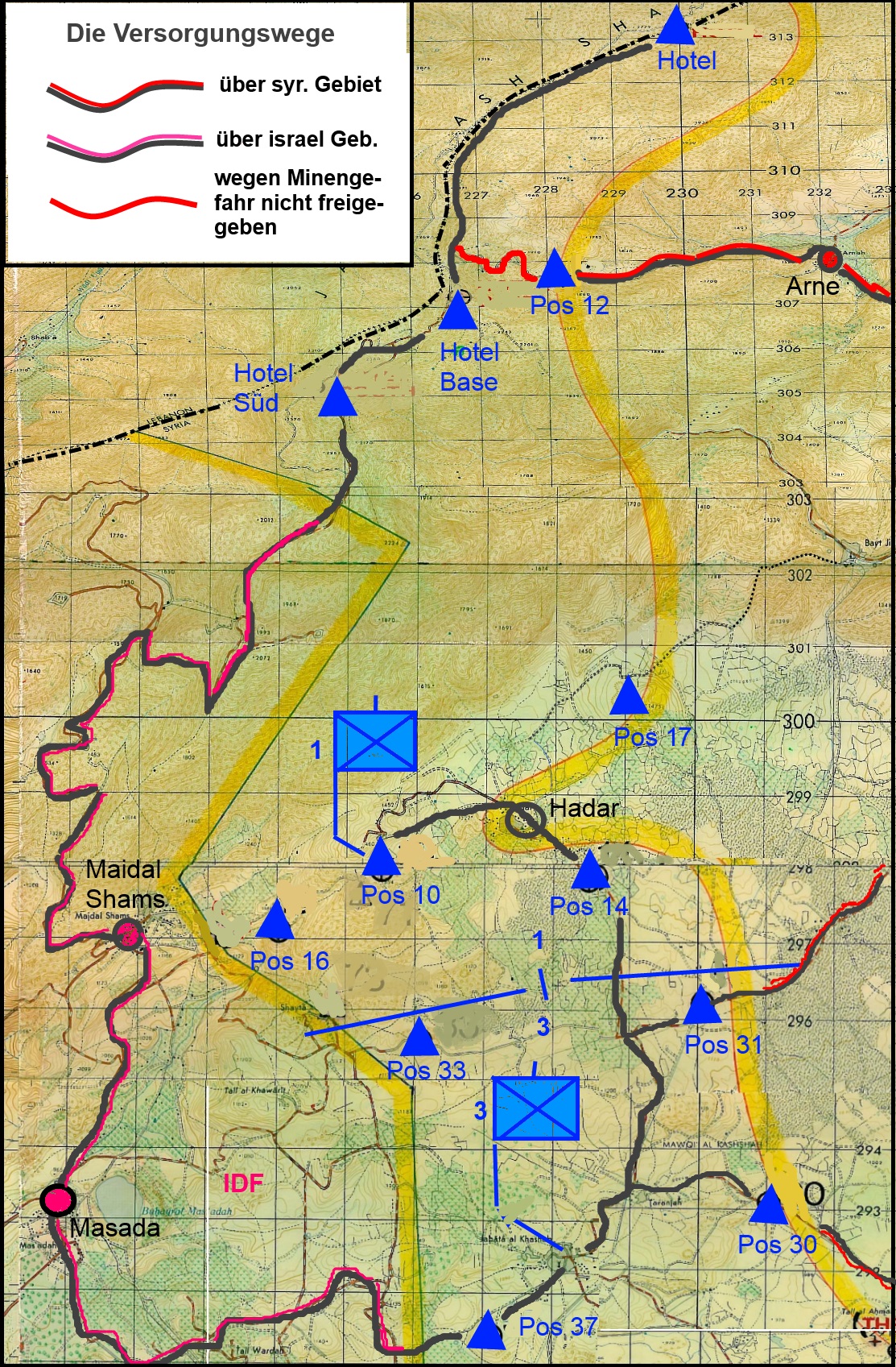 Danach besuche ich den Azem Palast mit seinen wunderschönen Gärten. Die wohltuende Ruhe, die von hier ausgeht, steht im krassen Gegensatz zu dem hektischen Treiben im Souk und auf dem Ausstellungsgelände. Während der Rückfahrt nach Quanaquer fallen mir die Augen zu, ein ermüdendes Briefing im Kommando gibt mir den Rest. Es sollte aber noch nicht alles sein: Beim 1. Zug wird ein Palästinenser aufgegriffen. Er ist bewaffnet und in Uniform der Fatahkämpfer. Er sagt aus, dass er den Abzug der Israelis beo-bachten sollte. Auf Anordnung des Bataillons wird er über die syrische Straße mit einer Es-korte zu Fuß ins Tal gebracht und den Organen der UNDOF übergeben. Samstag 29. JuniDer Tag vergeht ohne Zwischenfälle. Am Nachmittag melden sich wieder einige kranke Zivilisten und werden von SanUO VzLt Plunder behandelt. Am Nachmittag sind wir wieder bei der bekannten Familie in Hadar eingeladen. Sonntag 30. JuniBesuch von OpsO Mjr Bauer: es geht um die endgültige Festlegung der Positions, leider ohne Ergebnis. Dazu erscheint noch Burgstaller und verbreitet Wohlwollen. Danach wieder Aufre-gung im Dorf - ein Kind wurde durch einen Blindgänger schwer verletzt. SanUO Plunder leistet erste Hilfe und veranlasst den Transport nach Damaskus. Wie wir erfahren ist das Kind außer Lebensgefahr. Abends Briefing und Anweisungen für die vom Bataillon angeordnete Inventur. Montag 01. JuliDie Inventur verläuft Planmäßig, ohne wesentliche Beanstandungen. Dafür eine neue Hiobsbotschaft: die Positions am Hermon sind abgeschnitten, da die Israelis die über ihr Gebiet Straße gesperrt hatten. Die Versorgung über die syrische Straße war nicht möglich, weil sie für den Fahrzeugverkehr noch nicht freigegeben und nur zu Fuß begehbar war. Die von den polnischen Pionieren angesagte Räumung ist aus unerfindlichen Gründen noch nicht erfolgt, den Beteuerungen von IDF, die Straße wäre nun sicher, wurde verständlicher Weise nicht mehr Glauben geschenkt.