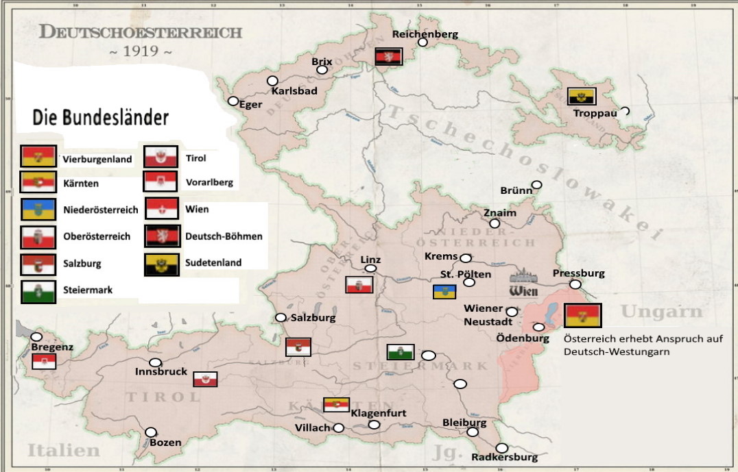 Deutsch-Österreich beansprucht Deutsch-WestungarnBereits in der ersten Sitzung der Provisorischen Nationalversammlung wurde die Forderung nach Anschluss des vorwiegend deutschsprachigen Westungarns gestellt und am 12. November 1918 wurde in der "Staatserklärung über Umfang, Grenzen und Beziehungen des Staatsgebietes von Deutschösterreich", festgelegt, dass alle in der vormaligen Donaumonarchie diesseits und jenseits der Leitha gelegenen, geschlossenen deutschen Siedlungsgebiete dem Staatsverband der Republik Deutsch-Österreich angehören.