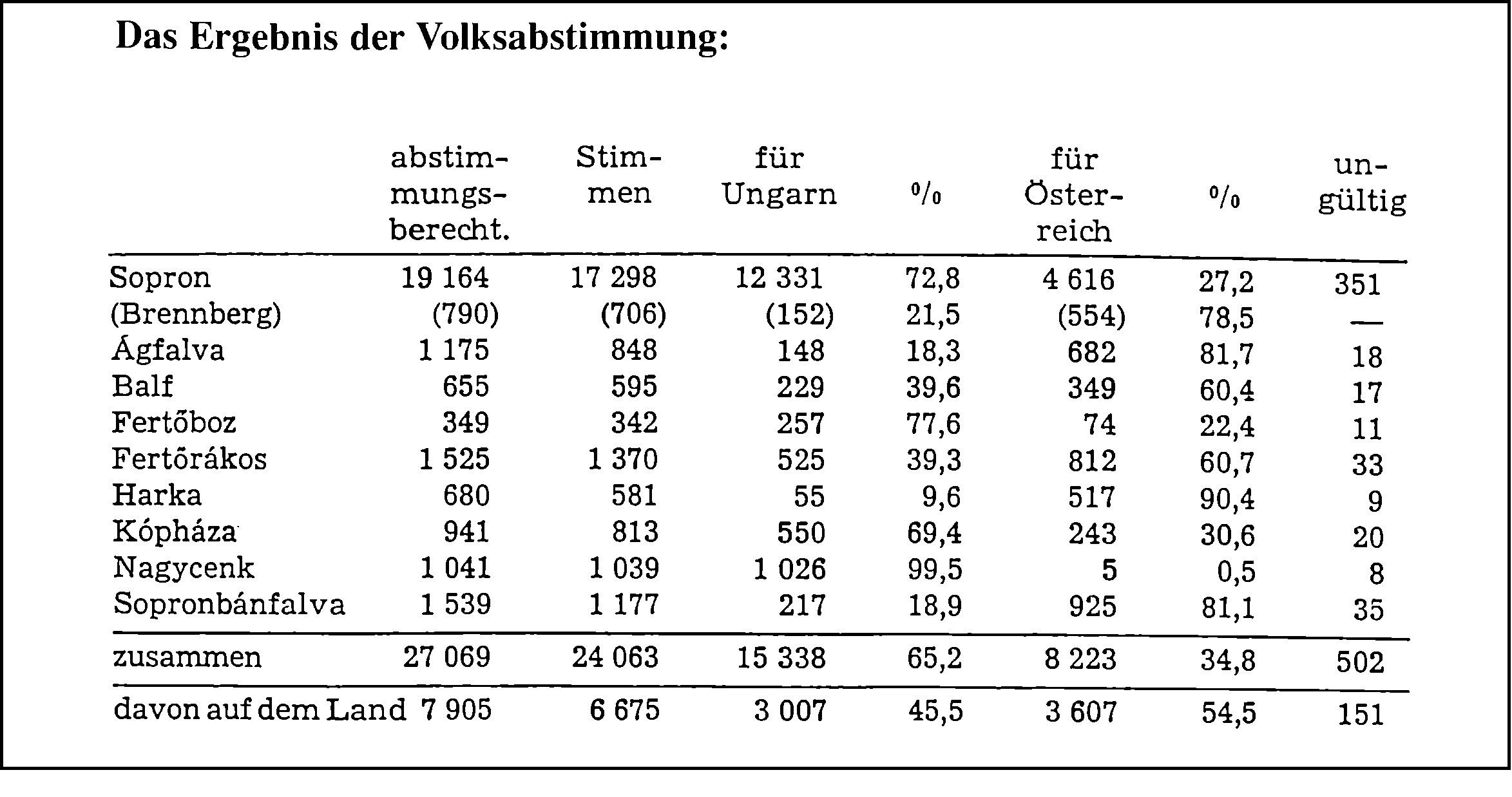 Man könnte den im Friedensvertrag von St. Germain zuerkannten Anschluss des Burgenlandes an Österreich als Trostpreis betrachten, nachdem die junge Republik trotz des zustehenden Selbstbestimmungsrechts, aller deuschsprachigen Gebiete Südtirol, Deutsch-Böhmen und Südmähren beraubt war. Und aus damaliger Sicht war das auch der Fall, denn lieber hätte man Südtirol als historisch unverzichtbaren Landeteil und die böhmischen und mährischen Länder wegen ihrer hochentwickelten Indusriebetriebe und reichen Bodenschätze behalten, als sich Probleme mit dem ebenso geschröpften Nachbarland Ungarn einzuhandeln. Das Endergebnis aus einer zwei Jahre währenden, für beide Seiten in menschlicher und materieler Hinsicht verlustreichen Auseinendersetzungen, war dementsprechend auch mager und für beide Seiten unbefriedigend. Das Burgenland bekam nicht die naturgemäß zustehende Hauptstadt, Ungarn musste zu den ohnehin horrenden Gebietsverlusten auf Westungar verzichten. Ödenburg dürfte dann für Ungarn als Trostpreis gegolten haben.