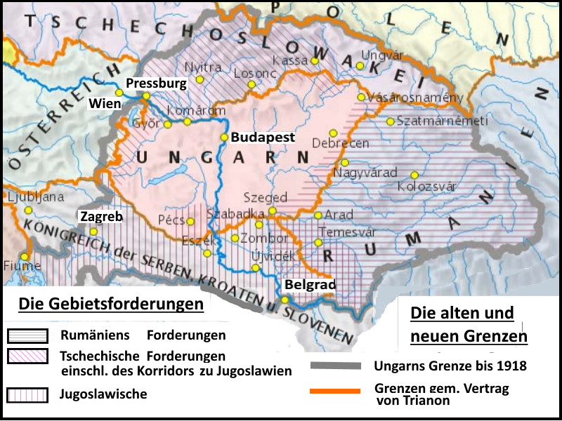 In der österreichischen Reichhälfte hatte am 30. Oktober 1918 die von allen deutschen Abgeordneten der im "k.k. Reichsrat vertretenen Königreiche und Länder" gebildete "Provisorische Nationalversammlung" die Republik Deutsch-Österreich ausgerufen und als Teil des Deutschen Reichs erklärt, wärend der noch von König Karl (1) eingesetzte ungarische Ministerpräsident Mihály Károlyi zwei Wochen später die "Ungarischen Demokratischen Republik" ausrief. Österreich glaubte noch zu diesem Zeitpunkt seine nationale Einheit auf Grund des Selbstbestimmungsrechts erhalten zu können, in Ungarn ließen die im Waffenstillstand von Belgrad festgelegten Grenzen hoffen, mit geringen Gebietsverlusten davon zu kommen. |